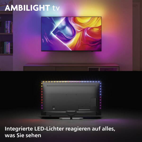 Stellen Sie sich vor: Das integrierte LED-Licht reagiert auf alles, was Sie sehen, und sorgt für beeindruckende farbige Lichteffekte. Ambilight verändert alles: Ihr Bildschirm wirkt jetzt größer, sodass Sie tiefer in alle Ihre Lieblings-TV-Sendungen eintauchen können. Wenn Sie es einmal erlebt haben, werden Sie nie wieder einen anderen Fernseher ohne Ambilight wollen.